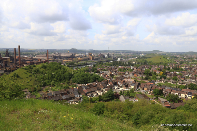 IMG_7213La montée s’effectue sur le flanc Ouest, dominant le côté industriel le long de la Sambre et du Canal Charleroi-Bruxelles. Paysage impressionnant s’il en est, toutes ces usines semblent si proches. C’est avec ce paysage-là, du haut du terril des Piges,  que l’on prend conscience de l’immensité des terres industrielles dans l’environnement de Charleroi.