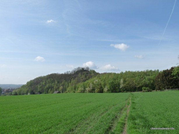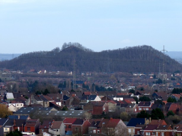 Le terril du GOUFFRE  face Ouest, vu du sentier perpendiculaire au Sentier de Gilly vers la rue Jouay. En été, la silhouette du terril est moins caractéristique.