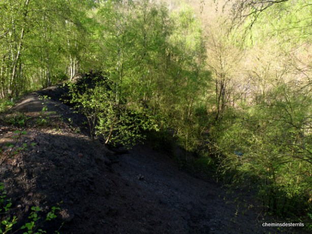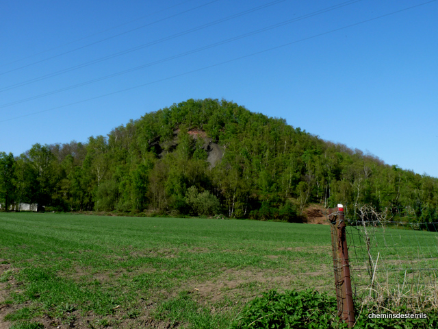 Les schistes rouges apparents indiquent des combustions sommitales sur le terril.