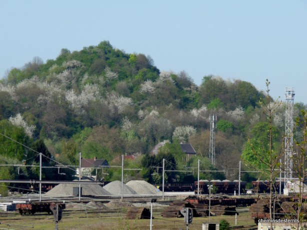 Un énorme bouquet de fleurs domine le paysage industriel. Image zoomée du terril du GOUFFRE derrière la gare de formation de Châtelineau.