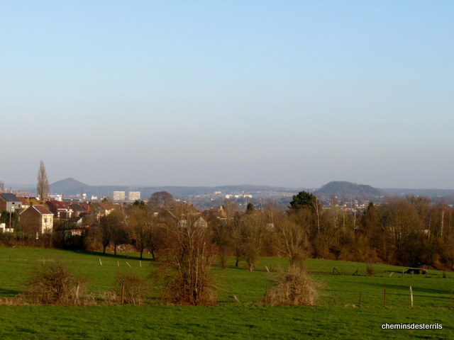 Plein Est,  la vallée de la Sambre. Le panorama s’étend jusque Châtelet et le terril du BOUBIER (à  g.) A droite sur l’image, le terril des HIERCHEUSES, au lieu-dit la TOMBE à Marcinelle.