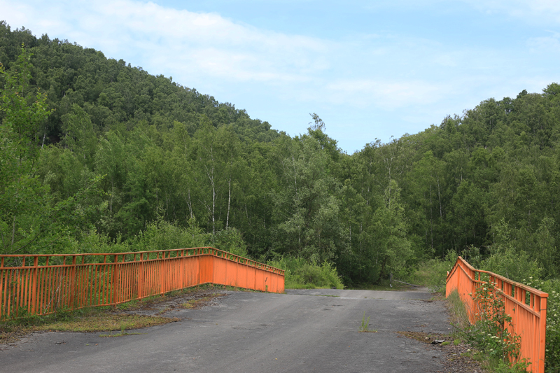 Pont sur l’ancienne voie de chemin de fer depuis le hangar à locomotives. Vue sur les 2 terrils du charbonnage. A l’instar des terrils, les voies de chemins de fer désaffectées (Ravel ou voies « oubliées ») agissent sur l’environnement en tant que couloirs écologiques.